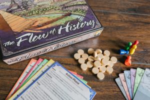 The Flow of History sa objavila ako blesk z jasného neba v mojej zbierke vo februári 2018 a odvtedy je suverénne najhranejšou hrou, kdekoľvek som ju priniesol a ktokoľvek ju vyskúšal. Páčila sa doteraz všetkým až natoľko, že nikdy neostalo iba pri jednom zahraní, ako to v tomto období množstva noviniek zvyčajne býva. Flow of History je jednoduchá kartová hra, ktorá má jeden neskromný cieľ: previesť 2-5 hráčov od úsvitu ľudskej civilizácie, cez jej vrcholy a pády v priebehu vekov, až po súčasné výdobytky ľudskej vynaliezavosti, vedy, techniky a poznania. Zvyčajne si na takúto tému hráči musia rezervovať 3 až 5 hodín času a prebíjajú sa všakovakými úskaliami veľkých civilizačných hier. Flow of History prináša úplne odlišný, a pritom stále uspokojujúci zážitok – partie končia do jednej hodiny a dojmy sú také silné, že hráči majú nutkanie odohrať odvetu okamžite. Na stole sa pritom pred vami objaví minimum materiálu a príprava hry trvá extrémne krátko: 4 mince každému, náhodná vstupná technológia hráčovho prvotnopospolného kmeňa, ponuka piatich základných technológií, divov alebo vodcov a je to! Krabička hry plní skvelo funkciu zásobníka zdrojov a kariet. Karty sú rozdelené nielen podľa svojho druhu (vojenské, politické, vedecké, výrobné, divy a vodcovia), ale aj podľa veku na A-I-II-III-IV-V. Napokon tu máme ešte dve posledné karty, predstavujúce súčasný fenomén poznania Internet a samotnú Budúcnosť (Future). Kúzlo hry spočíva v jej jednoduchosti – vo svojom ťahu má hráč na výber z piatich možností: zainvestovať do karty v ponuke, ukradnúť kartu inému (samozrejme za adekvátne zdroje), priložiť obsadenú kartu z ponuky do svojej civilizácie (priestoru hráča), vyvolať akciu, alebo doplniť vzácne zdroje. V každej chvíli tak stojí hráč pred zaujímavými rozhodnutiami ako pokračovať v toku dejín, ovplyvniť vývoj svojej civilizácie alebo spomaliť rozvoj tých susedných. Prehľadná ikonografia umožňuje hrať hru bez znalosti cudzieho jazyka. Veľmi príjemným bonusom sú nádherné kovové mince zdrojov, ale aj krátke citáty slávnych osobností na spodnom okraji každej z kariet. Herný zážitok, interakcia medzi hráčmi, rozhodovacie procesy, zábava a rýchlosť odohratia každej partičky Flow of History je mix, ktorý jednoznačne predurčuje túto hru na nomináciu za hru môjho roka 2018.