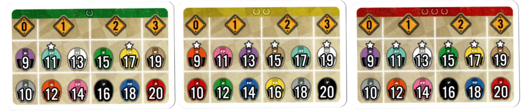 Karty legiend (36x) tieto karty úplne nahradia pôvodné karty legiend (tie odložíte niekam, kde ich ani slnko nenájde). Týchto 36 kariet sú tvorené tromi setmi – zelený, žltý a červený. Tieto sety vám vhodným miešaním tvoria obtiažnosť (resp úroveň) Legiend. Týchto úrovní je 6, pričom samotný zelený balíček tvorí druhú najľahšiu úroveň, zatiaľ čo červený najťažšiu. Zmiešaním zeleného a žltého vytvoríte úroveň 3 a pod. Pýtate sa, ako teda spraviť úroveň 1? Použijete zelený balík, ale nevyužijete ikony hviezd na kartách. Viac povie obrázok: